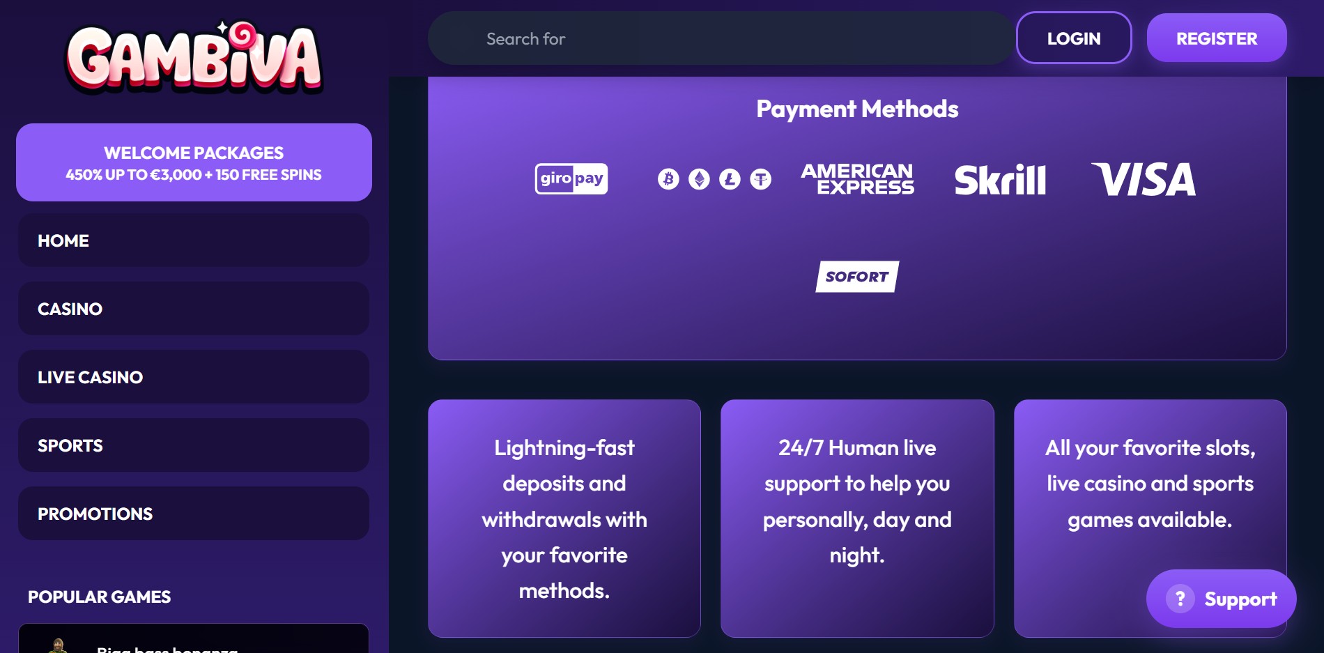 Yes, this is one of the platform’s key features. Gambiva accepts major cryptocurrencies such as Bitcoin, Ethereum, and Tether (USDT). Crypto deposits are usually instant and offer a higher degree of privacy than traditional banking methods. Withdrawals via crypto are also generally faster than fiat currency options.